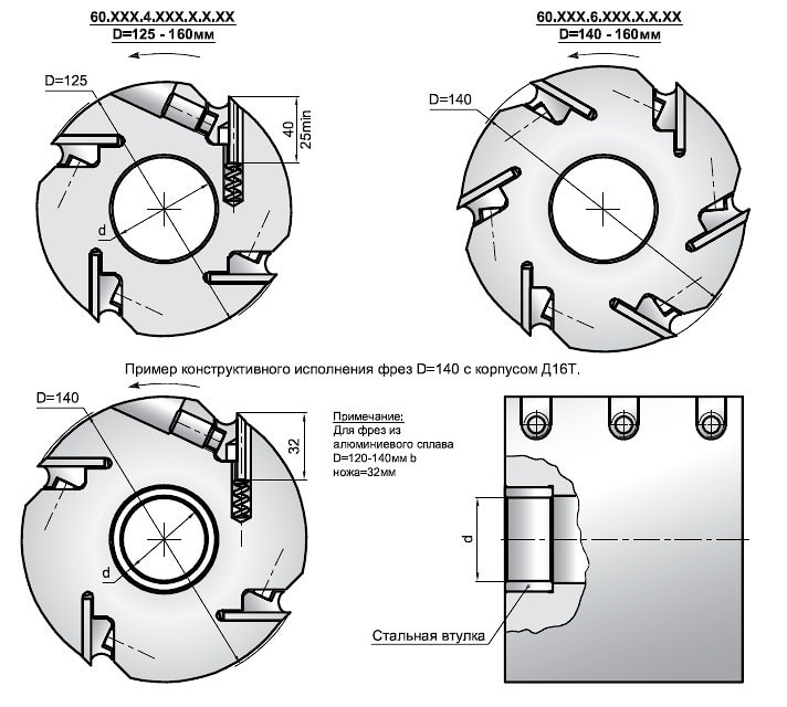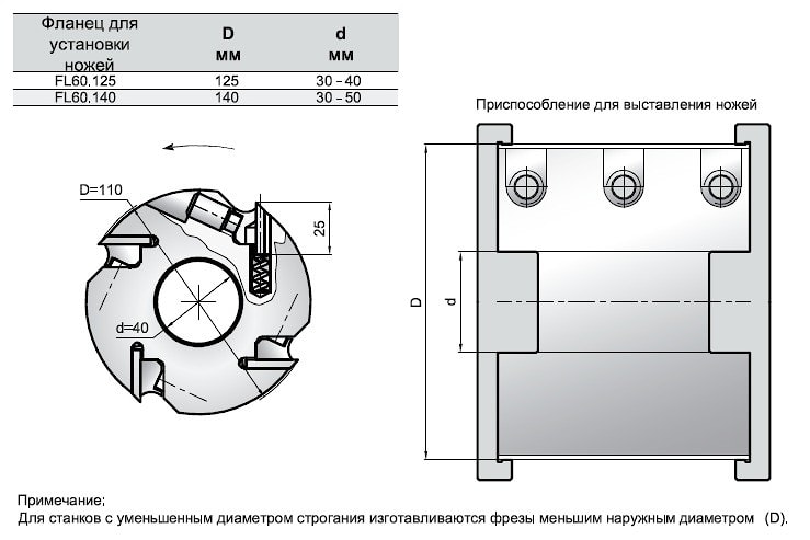 Фрезы строгальные применяются в основном на четырехсторонних продольно-строгальных и калевочных станках для создания плоской и ровной поверхности на заготовке. В основном, эти фрезы предназначены для строгания мягкой и твердой древесины. В редких случаях - для плитных материалов ( МДФ, ДСтП). В этом случае применение фрезы определят материал ножей, установленных на фрезе. Для выставления ножей после заточки или полной замены рекомендуется применять приспособление ИБЕРУС-КИЕВ 60.125.40 или 60.140.40 в зависимости от диаметра строгальной фрезы.
