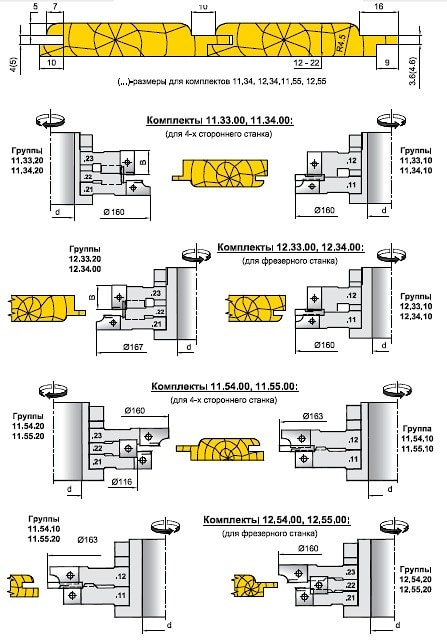 В случае обработки лицом вагонки вверх применяется комплект фрез 11.54.00 или 11.55.00.
