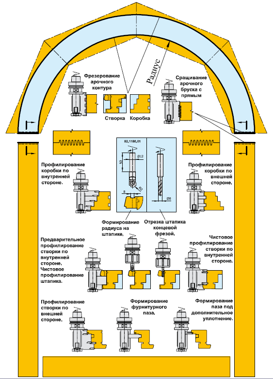 Концевые фрезы для арочного окна применяются для профилирования элементов окна - фрезы для внутреннего и внешнего профиля оконной рамы, фрезы для внутреннего и наружного профиля оконной рамы, фрезы для профилирования штапика, если он изготавливается отдельно.