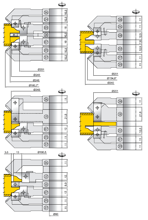 Подобная технология реализована для всех стандартных профилей 03.01.00 - 03.10.00.Суть технологии такого комплекта фрез состоит в том, что места склейки древесины и МДФ, а также сам лист МДФ обрабатываются стандартными поворотными ножами. Это дает возможность снизить стоимость дополнительных комплектов ножей, а также увеличить ресурс ножей, т.к. применяемые стандартные поворотные ножи имеют 4 режущие грани.