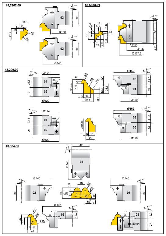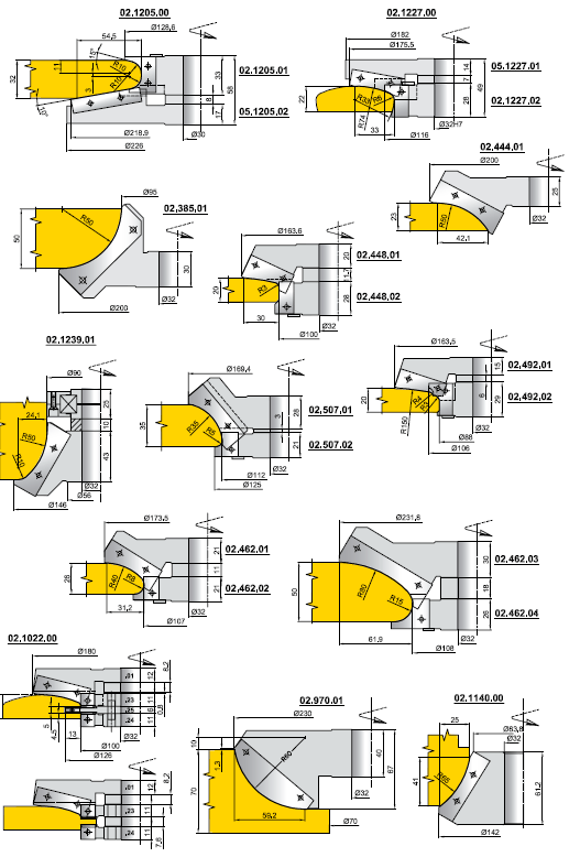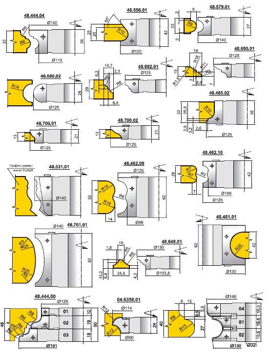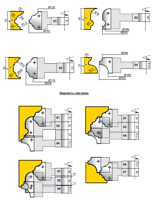 Сюда могут входить фрезы для штапика и декоративной раскладки, фрезы для радиусных пазов, фрезы для карнизов, молдингов, канелюров и капителей, фрезы для столешниц и подоконников, фрезы для обработки края деревянных деталей и многие другие.