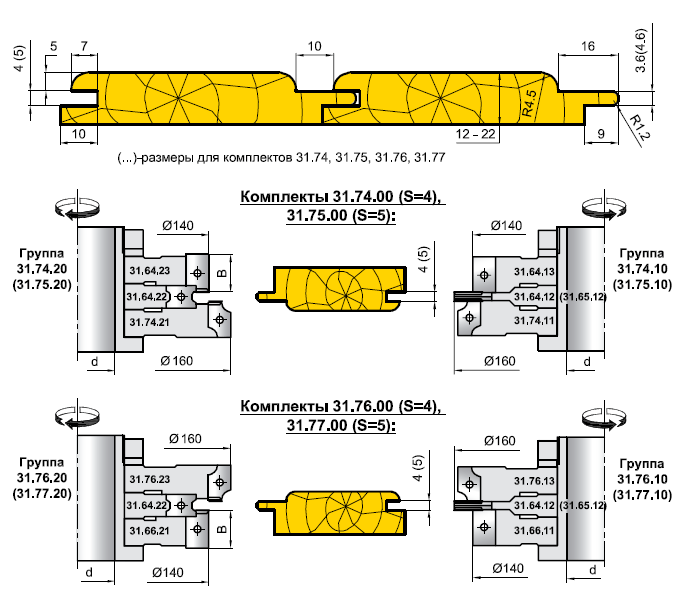 Комплект фрез предназначен для производства вагонки на четырехсторонних станках с большой скоростью подачи от 18-20 м/мин. Фрезы выполнены по трехножевой схеме Z=3 для повышения качества обработки. Все ножи 2-х или 4-х ресурсные.